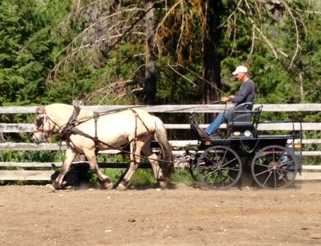 Lyn has been driven in a pair with our gelding, Magnum. Has had some single driving and has been ridden around the 320 acres. Orville’s choice if he is coming up for lunch from the corrals and doesn’t want to walk so will ride Lyn up. Tie him up to the hitching rail come in and have lunch, while Lyn stands quietly. Summer of 2017 we hauled Lyn, Magnum, Mina and Katie to Alberta, to visit our daughter and take part in a wagon ride. Lyn stood quietly the entire 16 hour trip which included blowing a tire on the trailer, limping to a parking area to change. Then getting the tire fixed as not a good idea to be going through the mountains with no spare. All in all was a long day for the horses that were incredibly well mannered the entire time.