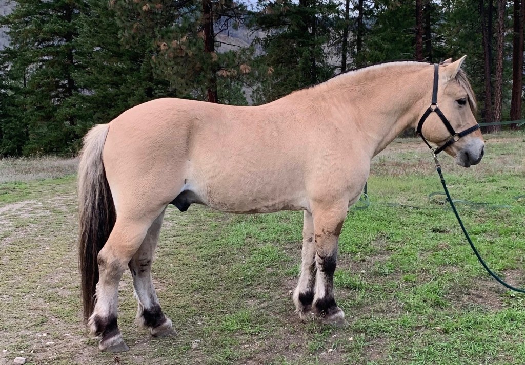 Anvil’s Magda, NFHR # 16-7485-M, is a brown dun mare, born May 21, 2016. Sire: Anvil’s Lyn, sired by Leidjo CFHA #370 NY #N1945 (we imported from Norway) and Dam:Anvil’s Magdalena CFHA# 2580 sired by Anvil’s Regin CFHA # 407. Magda is 14.1 hh as a new three year old. Magda was long lined in January in preparation for driving her in the spring. Magda has now been ridden a few times and is going away from home willingly in a relaxed manner. She is used to tie stall, hitching rail and being handled when brought in to do some ground work and now ridden in different terrain. As a three year old most of Magda’s days are spent running freely on the mountain side learning how to balance and handle herself in rough terrain making her an ideal candidate for Combined driving or any other discpline where balance and forward movement is desired.